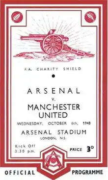 A.V. Alexander, the Minister of Defence presented Arsenal with the Shield.[13] Assessing the match the next day, Daily Express football correspondent John MacAdam wrote: "Charity begins at home, they say, and, by golly, it began at Highbury yesterday, for Arsenal were the luckiest team in the world to beat Manchester United 4–3 in the F.A. Charity Shield match between the winners of the League and the Cup."[14] The Times correspondent assessed, "Arsenal won because they sneaked a commanding lead of three goals, before Manchester had realised they were in London," and concluded the piece with the sentence "It had been a game worthy of the occasion and of two fine clubs."[13] Gate receipts for the match totalled £4,300.[14]