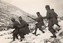 Along with the neighbouring 15th Infantry Regiment, the 42nd Regiment faced the Italian armoured division Centauro.[31] The Italian invasion of Greece began on 28 October with an artillery bombardment followed by an infantry attack against the regiment's covering elements. As a result, the 2nd Battalion withdrew to the south of Delvinaki, and on the next day regrouped at Mazaraki.[33] On the same day, the regiment established its three battalions in defensive positions along the line Chavos Height–Makrynoros–Sossinou Monastery–Repetista. From 30 October to 4 November, the regiment withstood enemy bombardment and repulsed minor Italian attacks, while strengthening its positions.[34] On the night of 4/5 November, the regiment was ordered to retreat to a line between Agios Ilias height and Vrontismeni. 1st and 3rd Battalion, along with the 2nd Machine-Gun Battalion, were deployed on the line, while 2nd Battalion was kept in reserve.[34] The new line was kept under bombardment for two consecutive days, but on the night of 10/11 November, the regiment carried out a reconnaissance in force towards the Siastis height that resulted in the capture of 90 prisoners.[34]