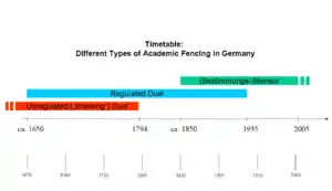 Until the first half of the 19th century, all types of academic fencing can be seen as duels, since all fencing with sharp weapons was about honour. No combat with sharp blades took place without a formal insult. Compared to pistol duels, these events were relatively harmless. The fight regularly ended when a contestant received a wound at least one inch long that produced at least one drop of blood. It was not uncommon for students to have fought approximately 10 to 30 duels of that kind during their university years. The German student Fritz Bacmeister is the 19th-century record holder, due to his estimated 100 mensur bouts fought in Göttingen, Jena, and Würzburg between 1860 and 1866.[3] In the 20th and 21st century it was Alexander Kliesch (Landsmannschaft Brandenburg Berlin) with 70.