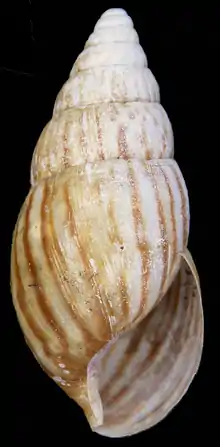 The somewhat thin and fragile shell is small compared to what is known from the other achatinids in southern Africa, its length/height is less than 45 mm with about 7½ whorls. (This description is in contradiction to Connolly (1925),[3] who probably attributes a wrongly identified shell 63.2 mm long to this taxon – a statement not repeated in his 1939 monograph.[2]) The length is always more than two times the maximum diameter, which is situated at about the level of the apex of the aperture.[2] The length of the aperture is always less than half that of the shell; the length of the last whorl in front view is always under three quarters of the total length. The apex is comparatively blunt. The whorls are hardly convex, including the body whorl.[2] The aperture is fairly narrow (greatest width just under the middle) with a thin outer lip; the columella is white, short and narrow, concave with a slight twist, obliquely truncate close to the base. The nepionic whorls are wrinkled and granulose, though always worn in the material studied.[2] The sculpture consists of regular and close wrinkles resulting in a reticulate-granulate pattern, very prominent below the sutures but well visible on all whorls; in addition there are very faint growth striae.[2] All specimens exhibit a close and fine zebra pattern with irregular, orange-brown flames on a yellowish-brown background; there is a very thin and deciduous periostracum.[2] On the whole this seems to be a well-defined taxon because of the size, shape and sculpture of the shell.[2]