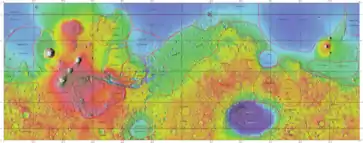 Acidalia Planitia is a plain on Mars, between the Tharsis volcanic province and Arabia Terra to the north of Valles Marineris, centered at 49°48′N 339°18′E / 49.8°N 339.3°E.[1] Most of this region is found in the Mare Acidalium quadrangle, but a small part is in the Ismenius Lacus quadrangle. The plain contains the famous Cydonia region at the contact with the heavily cratered highland terrain.