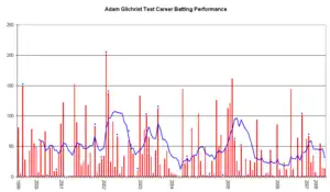 From the time of his debut up to the 2003 World Cup, Gilchrist's played in 40 Tests in series. With the exception of the 2001 tour of India, when he averaged 24.80 (he made 124 runs in the series; 122 of them came in one innings), his performances with the bat were such that he was described at the time as the "finest batsman-wicketkeeper to have graced the game".[129] At one point in March 2002, Gilchrist's Test average was over 60; the second-highest for any established player in Test history,[130] and he topped the ICC Test batting rankings in May 2002.[131]