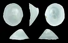 The maximum recorded shell length is 20.3 mm.[2] The size of the ovate shell varies between 8 mm and 20 mm. It is thin and whitish. The apex presents an appearance as if an embryonic tip (perhaps spiral) had fallen and been replaced by a peculiarly blunt ovate apex, which in the young shell is nearly marginal, posterior and to the left of the middle line, but in the adult is considerably within the margin, curved downward and backward and much more asymmetrical. The sculpture of the shell shows faint grooves radiating from the (smooth) apex and reticulated by the stronger concentric lines of growth, beside which the extremely inflated arch of the back is somewhat obscurely concentrically waved. The shell has a polished appearance over the sculpture. The thin margins are sharp. The interior of the shell is smooth and somewhat polished. The scar of the pedal muscle is narrow and at a considerable distance within the margin. The anterior ends of the scar are enlarged and hooked backward on their inner edges. These ends are connected by a line broadly arched forward and marking the attachments of the mantle to the shell over the head.[3]