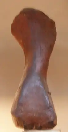 French paleontologist Paul Gervais described the new genus in 1852[1] based on a humerus found at Mont Ventoux, near Bédoin, by Prosper Renaux (1793–1852) in 1841.[2] The bone was 90 cm (35.43 in) long, 33 cm (13 in) wide at the proximal end, 15 cm (5.91 in) wide in the middle, and 25 cm (9.84 cm) wide at the distal end. From the same locality, he referred a conical tooth he thought could belong to a larger second species, and from elsewhere added to A. sp. (a practice used to denote that the remains belong to a certain genus, but the species is not known) a partial humerus and ulna.[1] The proximal part of the humerus of Aepisaurus elephantinus is housed in the University of Montpellier (BED01). A plaster cast of the complete specimen is also displayed in the Muséum national d'Histoire naturelle in Paris (MNHN 1868–242).[2]