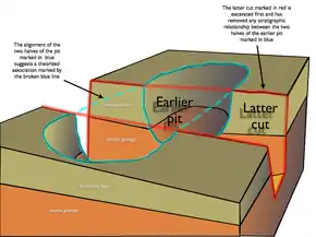 Alignment example: Two halves of a pit separated by a later cut can have their archaeological association inferred by noting their alignments