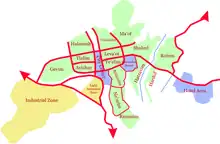 Each neighborhood in Arad contains streets named in a thematic manner, for example, a neighborhood where all streets are named after jewels. The exception to this are the four central quarters, which have more conventional street names, and the original two neighborhoods (Rishonim and Ne'urim). The themed neighborhoods make up the entire city north of Highway 31. South of the highway is Arad's industrial zone (the northern area being the light industry zone). The neighborhoods are as follows: