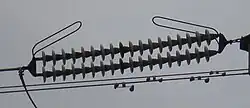 Arcing horns (sometimes arc-horns) are projecting conductors used to protect insulators or switch hardware on high voltage electric power transmission systems from damage during flashover. Overvoltages on transmission lines, due to atmospheric electricity, lightning strikes, or electrical faults, can cause arcs across insulators (flashovers) that can damage them. Alternately, atmospheric conditions or transients that occur during switching can cause an arc to form in the breaking path of a switch during its operation. Arcing horns provide a path for flashover to occur that bypasses the surface of the protected device.[1] Horns are normally paired on either side of an insulator, one connected to the high voltage part and the other to ground, or at the breaking point of a switch contact. They are frequently to be seen on insulator strings on overhead lines, or protecting transformer bushings.