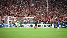 The longer boundary lines are touchlines, while the shorter boundaries (on which the goals are placed) are goal lines. A rectangular goal is positioned on each goal line, midway between the two touchlines.[118] The inner edges of the vertical goal posts must be 7.32 m (24 ft) apart, and the lower edge of the horizontal crossbar supported by the goal posts must be 2.44 m (8 ft) above the ground. Nets are usually placed behind the goal, but are not required by the Laws.[119]