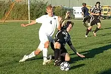 At a professional level, most matches produce only a few goals. For example, the 2005–06 season of the English Premier League produced an average of 2.48 goals per match.[95] The Laws of the Game do not specify any player positions other than goalkeeper,[96] but a number of specialised roles have evolved.[97] Broadly, these include three main categories: strikers, or forwards, whose main task is to score goals; defenders, who specialise in preventing their opponents from scoring; and midfielders, who dispossess the opposition and keep possession of the ball to pass it to the forwards on their team. Players in these positions are referred to as outfield players, to distinguish them from the goalkeeper.
