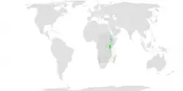 The augur buzzard is found in eastern and southwestern Africa. Despite its erratic-seeming distribution, it is often common in its range. The augur buzzard is found from eastern Sudan and Ethiopia[11] (also northern Somalia, inhabited by the subspecies B. a. archeri) down through the northeast of the Democratic Republic of the Congo, Uganda, Kenya, parts of Tanzania into Zambia, Malawi, Zimbabwe, Mozambique, western Angola and west-central Namibia.[1][2] Despite its wide range in southern Africa it appears to only occur in South Africa as a vagrant.[12] The augur buzzard is found in open or light wooded upland areas but can also range into lowland deserts at sea level (such as in Namibia) and some more mountainous, precipitous areas of eastern Africa. They seem to prefer to hunt in elevated savanna grasslands, high moorland, cropland[11] sometimes into open forest or desert edges as well. Augur buzzards in east Africa usually live between 400 and 4,600 m (1,300 and 15,100 ft) elevation but normally occur above 1,500 m (4,900 ft) and have been recorded living at 5,000 m (16,000 ft) in Ethiopia.[2]