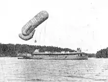 In 1849 the Austro-Hungarian naval ship SMS Vulcano took part in the first aggressive use of balloons in warfare,[1][2] serving as a balloon carrier (the precursor to the aircraft carrier)[3] in the first offensive use of air power in naval aviation.[4][5][6] Austrian forces besieging Venice attempted to float some 200 paper hot air balloons, each carrying a 24- to 30-pound bomb that was to be dropped from the balloon with a time fuse over the besieged city. The balloons were launched mainly from land; however, some were also launched from Vulcano. The Austrians used smaller pilot balloons to determine the correct fuse settings. At least one bomb fell in the city; however, due to the wind changing after launch, most of the balloons missed their target, and some drifted back over Austrian lines and the launching ship Vulcano.[7][8][9]