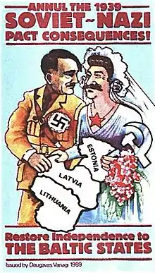 The Soviet Union denied the existence of the secret protocols to the Molotov–Ribbentrop Pact, even though they were widely published by western scholars after surfacing during the Nuremberg Trials.[4] Soviet propaganda also maintained that there was no occupation and that all three Baltic states voluntarily joined the Union – the People's Parliaments expressed people's will when they petitioned the Supreme Soviet of the Soviet Union to be admitted into the Union.[5] The Baltic states claimed that they were forcefully and illegally incorporated into the Soviet Union. Popular opinion was that the secret protocols proved that the occupation was illegal.[6]