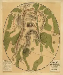 Lee wished to renew the attack on Friday, July 3, using the same basic plan as the previous day: Longstreet would attack the Union left, while Ewell attacked Culp's Hill.[76] However, before Longstreet was ready, Union XII Corps troops started a dawn artillery bombardment against the Confederates on Culp's Hill in an effort to regain a portion of their lost works. The Confederates attacked, and the second fight for Culp's Hill ended around 11 a.m. Harry Pfanz judged that, after some seven hours of bitter combat, "the Union line was intact and held more strongly than before".[77]