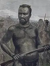 The Battle of Isandlwana (alternative spelling: Isandhlwana) on 22 January 1879 was the first major encounter in the Anglo-Zulu War between the British Empire and the Zulu Kingdom. Eleven days after the British invaded Zululand in Southern Africa, a Zulu force of some 20,000 warriors attacked a portion of the British main column consisting of approximately 1,800 British, colonial and native troops with approximately 350 civilians.[12] The Zulus were equipped mainly with the traditional assegai iron spears and cow-hide shields,[13] but also had a number of muskets and antiquated rifles.[14][15]