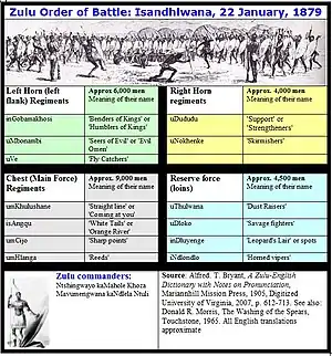 - ↑ F.E. Colenso, pp. 407–13 records two accounts of Zulu eyewitness participants at the battle. In one account the Zulu army is described as:"... consisting of the Ulundi corps about 3,000 strong, the Nokenke Regiment, 2,000 strong; the Ngobamakosi Regiment, including the Uve, about 5,000 strong: the Umeityu, about 4,000 strong; the Nodengwu, 2,000 strong; the Umbonambi, 3,000 strong; and the Udlhoko, about 1,000 strong, or a total of about 20,000 men in all ..." and in the other account the Zulu army is described as "... eight regiments strong (20,000 to 25,000 men) ... The regiments were Kandampenvu (or Umcityu), Ngobamakosi, Uve, Nokenke, Umbonambi, Udhloko, Nodwengu (name of military kraal of the Inkulutyane Regiment), and Undi (which comprises the Tulwana, Ndhlodho, and Indhluyengwe)."