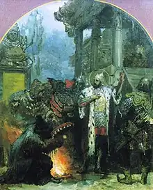 Prince Michael of Chernigov was passed between fires in accordance with ancient Turco-Mongol tradition. Batu Khan stabbed him to death for his refusal to do obeisance to Genghis Khan's shrine in the pagan ritual.