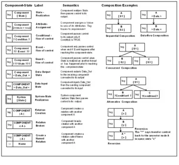 Behavior is expressed in terms of components realizing states and components creating and breaking relations. Using the logic and graphic forms of conventions found in programming languages, components can support actions, composition, events, control-flow, data-flow, and threads.[3]