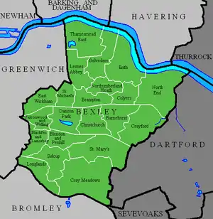 The 17 wards of the London Borough of Bexley (green) and surrounding London boroughs (light grey) and other districts (dark grey)