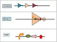 The BioBrick parts are used by applying engineering principles of abstraction and modularization. BioBrick parts form the base of the hierarchical system on which synthetic biology is based. There are three levels to the hierarchy: