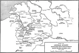 In the spring of 1349, the Jewish community in Frankfurt am Main was annihilated. That was followed by the destruction of Jewish communities in Mainz and Cologne. The 3,000-strong Jewish population of Mainz initially defended themselves and managed to hold off the Christian attackers. However, the Christians managed to overwhelm the Jewish ghetto in the end and killed all of its Jews.[11]
