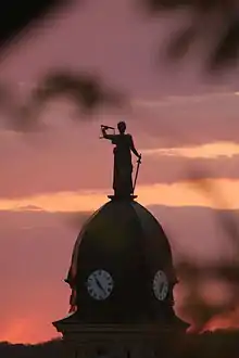 After much debate, a building was started in 1886. The new building, designed by Minneapolis architects Haley & Allen, combined a Second Empire roof and dome with Italianate features. The stone was provided by a local quarry, with various techniques giving it both rusticated and ashlar surfaces. The copper-sheathed dome is capped with a statue of Lady Justice.[5]