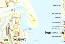 The island overlooks Portsmouth harbour.[1] At low tide a spit connects it with Priddy's Hard.[1] It has been suggested that the name dates from the 17th century and is derived from being within the borough of Gosport.[2]