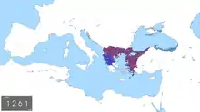 In 1261, while the bulk of the Latin Empire's military forces were absent from Constantinople, the Byzantine General Alexios Strategopoulos used the opportunity to seize the city with 600 troops. Thrace, Macedonia and Thessalonica had already been taken by Nicaea in 1246.[3] Following the capture of Constantinople, Michael ordered the blinding of John IV in December 1261, so as to become sole emperor.[3] As a result, Patriarch Arsenios excommunicated Michael, but he was deposed and replaced by Joseph I.