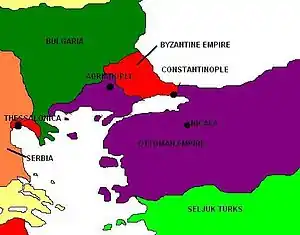 From the start, the regime faced numerous problems.[1] The Turks of Asia Minor had begun conducting raids and expanding into Byzantine territory in Asia Minor by 1263, just two years after the enthronement of the first Palaiologos emperor Michael VIII. Anatolia, which had formed the very heart of the shrinking empire, was systematically lost to numerous Turkic ghazis, whose raids evolved into conquering expeditions inspired by Islamic zeal, the prospect of economic gain, and the desire to seek refuge from the Mongols[2] after the disastrous Battle of Köse Dağ in 1243. The Palaiologoi were engaged on several fronts, often continually, while the empire's supply of food and manpower dwindled. In this period, the Byzantine Empire found itself continually at war, both civil and interstate, with most interstate conflicts being with other Christian empires. Most commonly, these comprised the Second Bulgarian Empire, the Serbian Empire, the remnants of the Latin Empire and even the Knights Hospitaller.