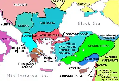 Following the Fourth Crusade, the Byzantine Empire had fractured into the Greek successor-states of Nicaea, Epirus, and Trebizond, with a multitude of Frankish and Latin possessions occupying the remainder, nominally subject to the Latin Emperors at Constantinople. In addition, the disintegration of the Byzantine Empire allowed the Bulgarians, the Serbs, and the various Turcoman emirates of Anatolia to make gains. Although Epirus was initially the strongest of the three Greek states, the Nicaeans succeeded in taking back the city of Constantinople from the Latin Empire.[3]