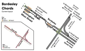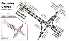 Furthermore, construction of the chords would necessitate the closure and demolition of the semi-operational Bordesley station.[20] There is an option to relocate Bordesley station either east or west of its current location as part of the chords' construction.[21] Rerouting of the up/down Snow Hill lines between Moor Street and the chords would also be required.