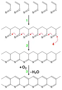 - High-temperature oxidative treatment of carbonization (hydrogen is removed). After this process of graphitization starts where nitrogen is removed and chains are joined into graphite planes.