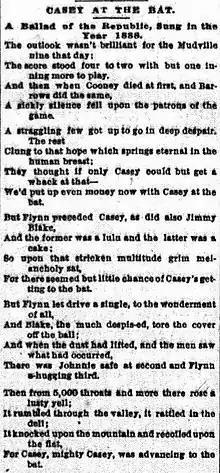 "Casey at the Bat: A Ballad of the Republic, Sung in the Year 1888" is a mock-heroic poem written in 1888 by Ernest Thayer. It was first published anonymously in The San Francisco Examiner (then called The Daily Examiner) on June 3, 1888, under the pen name "Phin", based on Thayer's college nickname, "Phinney".[1] Featuring a dramatic narrative about a baseball game, the poem was later popularized by DeWolf Hopper in many vaudeville performances.[2][3] It has become one of the best-known poems in American literature.