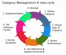 The industry standard model for category management in retail is the 8-step process, or 8-step cycle developed by the Partnering Group.[10] The eight steps are shown in the adjacent diagram; they are :