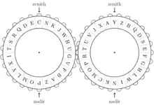 - Read the corresponding ciphertext letter at the zenith position on the cipher (left) disk.