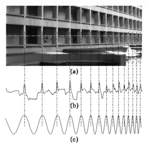 (a) In image processing, periodicity is often subject to projective geometry (i.e. chirping that arises from projection). (b) In this image, repeating structures like the alternating dark space inside the windows, and light space of the white concrete, chirp (increase in frequency) towards the right. (c) The chirplet transform is able to represent this modulated variation compactly.