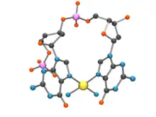 - ↑ Orbell JD, Solorzano C, Marzilli LG, Kistenmacher TJ (October 1982). "Preparation and structure of cis-chlorodiammine (N2, N2-dimethyl-9-methylguanine) platinum (II) hexafluorophosphate. A model for the intermediate in the proposed crosslinking mode of action of platinum (II) antitumor agents". Inorganic Chemistry. 21 (10): 3806–3810. doi:10.1021/ic00140a041.