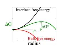 The green curve is the total (Gibbs if this is at constant pressure) free energy as a function of radius. Shown is the free energy barrier, , and radius at the top of the barrier, . This total free energy is a sum of two terms. The first is a bulk term, which is plotted in red. This scales with volume and is always negative. The second term is an interfacial term, which is plotted in black. This is the origin of the barrier. It is always positive and scales with surface area.