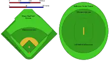 • The official minimum distance from home plate to the nearest fence, stand or other obstruction is 250 feet (76.2 m), and the recommended distances are at least 325 feet (99 m) along the foul lines and 400 feet (120 m) in center field.[25]:2