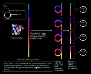 Recognition of conformational epitopes by B cells. Note how the segments widely separated in the primary structure have come in contact in the three-dimensional tertiary structure forming part of the same epitope[1]