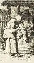 Van Gogh used a photograph of the original painting for this work.[45] Rather than vibrant colors, here he used softer shades of yellow, green and blue. The picture depicts the father, having put down his tools, holding his arms outstretched for his child's first steps. The mother protectively guides the child's movement.[46]