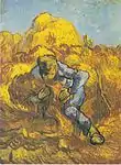 Van Gogh made twenty-one paintings in Saint-Rémy that were "translations" of the work of Jean-François Millet. Van Gogh did not intend for his works to be literal copies of the originals. Speaking specifically of the works after Millet, he explained, "it's not copying pure and simple that one would be doing. It is rather translating into another language, the one of colors, the impressions of chiaroscuro and white and black."[38] He made a copy of The Gleaners (Des glaneuses) by Millet.