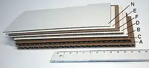 Corrugated fiberboard or corrugated cardboard is a type of packaging material consisting of a fluted corrugated sheet and one or two flat linerboards.[1] It is made on "flute lamination machines" or "corrugators" and is used for making corrugated boxes. The corrugated medium sheet and the linerboard(s) are made of kraft containerboard, a paperboard material usually over 0.25 millimetres (0.01 in) thick.