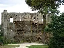 Geoffrey's son Fulk III Nerra ("the Black"; 21 July 987 – 21 June 1040) gained fame both as a warrior and for the pilgrimages he undertook to the Holy Sepulchre in Jerusalem to atone for his deeds.[5] He found himself confronted on his accession with a coalition of Odo I, count of Blois, and Conan I of Rennes. The latter having seized upon Nantes, of which the counts of Anjou held themselves to be suzerains, Fulk Nerra came and laid siege to it, routing Conan's army at the battle of Conquereuil (27 June 992) and re-establishing Nantes under his own suzerainty. Then turning his attention to the count of Blois, he proceeded to establish a fortress at Langeais, a few miles from Tours, from which, thanks to the intervention of the king Hugh Capet, Odo failed to oust him.