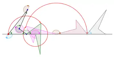 A cyclogon is obtained when a polygon rolls over a straight line. Let it be assumed that the regular polygon rolls over the edge of another polygon. Let it also be assumed that the tracing point is not a point on the boundary of the polygon but possibly a point within the polygon or outside the polygon but lying in the plane of the polygon. In this more general situation, let a curve be traced by a point z on a regular polygonal disk with n sides rolling around another regular polygonal disk with m sides. The edges of the two regular polygons are assumed to have the same length. A point z attached rigidly to the n-gon traces out an arch consisting of n circular arcs before repeating the pattern periodically. This curve is called a trochogon — an epitrochogon if the n-gon rolls outside the m-gon, and a hypotrochogon if it rolls inside the m-gon. The trochogon is curtate if z is inside the n-gon, and prolate (with loops) if z is outside the n-gon. If z is at a vertex it traces an epicyclogon or a hypocyclogon.[4]