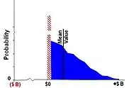 The DM real option employs the objective valuation formula where is the default threshold when it is economically rational to terminate (abandon) an opportunity event. If a simulation event (‘draw’) calculates a negative outcome (i.e., operating profits less than launch costs), then that event outcome should be rationally cut, or terminated, recording a residual. Only net positive economic outcomes are tallied. This operation leaves the misperception of ‘the odds being stacked’ favoring only positive outcomes seemingly resulting in an abnormally high valuation. However, the of the formula mathematically calculates the correct option value by adjusting these positive outcomes according to their likelihood, i.e., probability of a success (POS).[59]
