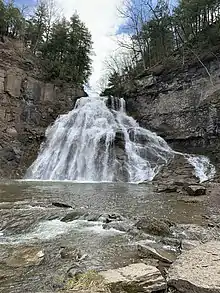 Delphi Falls is a two-tiered waterfall located in the 66 acres (27 ha) Delphi Falls Park on the East Branch of Limestone Creek southeast of Delphi Falls and west-southwest of Union. The lower falls are 62 feet (19 m) tall, while the upper are 54 feet (16 m). In 2018 the land, which had been privately owned and closed to the public for around fifty years, was purchased with contributions from a retired professor at Syracuse University who lived in Manlius, New York, (contribution of $750,000) and the Madison County government(contribution of $150,000).[1][2][3]