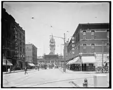 Denver Union Station is the main railway station and central transportation hub in Denver, Colorado. It is located at 17th and Wynkoop Streets in the present-day LoDo district and includes the historic station house, a modern open-air train shed, a 22-gate underground bus station, and light rail station.[5][6] A station was first opened on the site on June 1, 1881, but burned down in 1894. The current structure was erected in two stages, with an enlarged central portion completed in 1914.