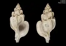 The length of the shell varies between 11 mm and 19 mm. The fusiform shell has a moderately high spire and a deep suture. The globose and smooth protoconch contains 1 1/2 whorl. The teleoconch shows strong, elevated, and rounded axial varices set quite far apart from each other (about 6 on the body whorl) and flat spiral cords which overrun the varices. The external surface form an intritacalx (= the chalky outer layer) which gives it a chalky appearance, even on fresh specimens, as is characteristic of the genus. The body whorl has maximum convexity just below the deep suture. Then it is rather parallel sided at the periphery and markedly constricted around the siphonal canal. The aperture is strongly thickened externally by the last varix, with an indistinct inner rim, bearing 5 faint denticles on aged specimens. It is glossy inside in contrast with the outer intritacalx. The siphonal canal is straight and open. The colour of the shell is dirty white, with indistinct yellowish lines along the spiral cords.[2]