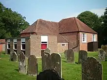 The chapel at Ditchling was situated in a field called Gunsfield. In 1821, most of this land was turned into a graveyard.[2][12] It replaced the original burial ground, which was full by 1760, and a small private plot "scarcely larger than the space covered by a small room" which had been created soon afterwards for the Browne family. This is on the other side of The Twitten from the main graveyard.[21] The oldest headstones in the original part of the burial ground date from 1730 and 1731.[22] In 1815–16, some of the Gunsfield land had been used by Robert Chatfeild junior's sons John and Robert to build a pair of single-sex schools.[12] They were Free Schools, funded by contributions from the chapel congregation and other donations. The boys' school was finished in 1815, and the girls' building was ready the year after. They were initially successful—Thomas Walker Horsfield noted that "at one time half the people of Ditchling were educated there"—but by the 1830s they were struggling financially, partly due to the sudden death of the rector of Westmeston who had been a major financial supporter.[23] Both schools closed in about 1836,[12] when a National School (not associated with the chapel) was opened elsewhere in the village.[24] The cottage of 1672, a timber-framed and wattle and daub building, was extended on its south side in 1808. The new section, taller than the original building, was built of brick and tiles. It housed the Elder of the chapel, who later became the schoolmaster.[11][12]