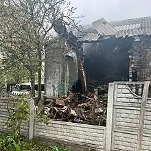 During the night of 3–4 June a Russian missiles struck a residential area killing a two-year-old girl and injuring another 22 people, including five children.[59] The attack destroyed or damaged several buildings in Pidhorodne, which lies on the outskirts of Dnipro city.[59][nb 1] According to the General Staff of the Ukrainian Armed Forces one Iskander-K missile had hit a two-story apartment building.[60] (According to local police) 10 private houses, cars, shops and gas pipelines were destroyed after a fire broke out as a result of the explosion.[61] The rescue operation was completed at 3:00 AM.[61]